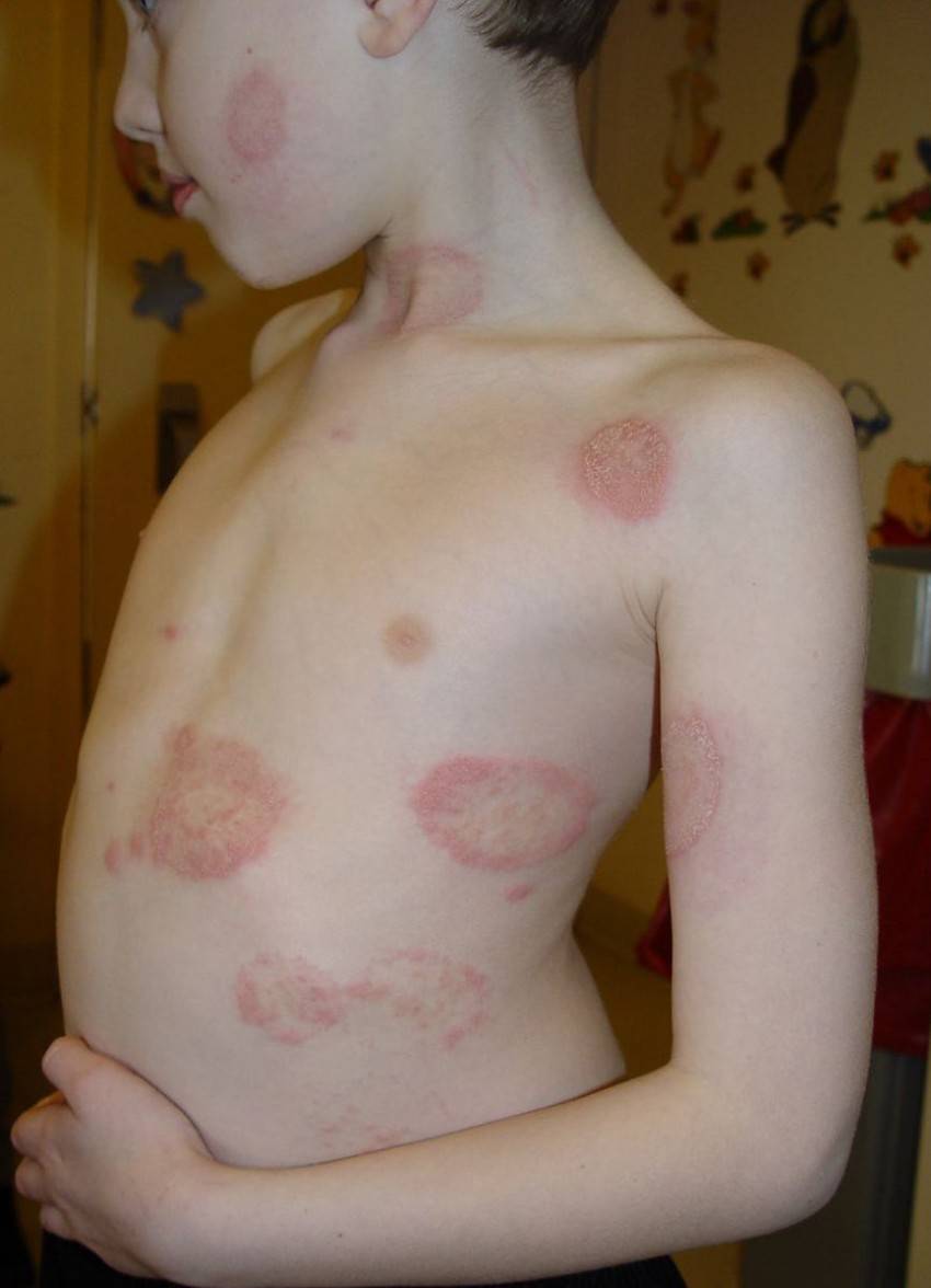 - начинается с одной материнской бляшки, которая появляется на груди;