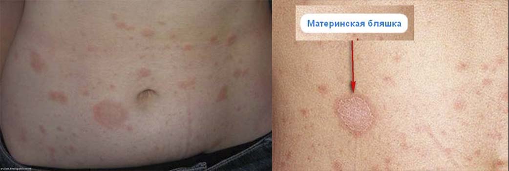 В течение нескольких недель пятна покрывают тело, а затем постепенно исчезают. На их месте остаются депигментированные участки кожи. Спустя некоторое время цвет выравнивается. Обычно местом появления материнской бляшки становится грудь. Далее поражаются шея, живот, плечи и бедра. На лице такой лишай диагностируется редко.