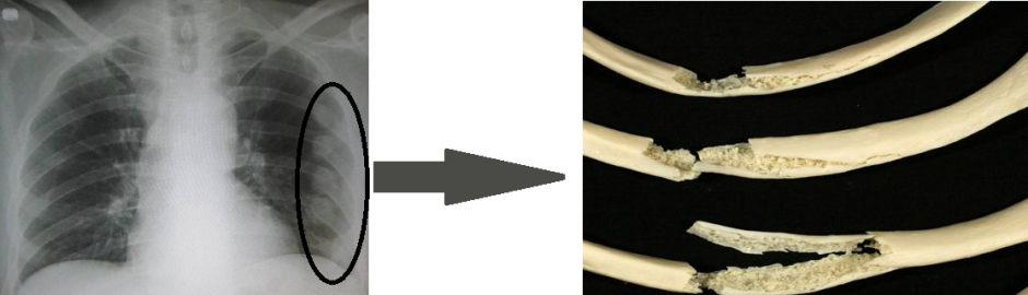 Травмы лёгких можно получить и при различных сильных ушибах торса, переломе рёбер или проникающих ранениях. В случае ушибов и переломах рёбер, не связанных с повреждением лёгочной ткани, воспаление опять же вызывают застойные процессы из-за сбоев в дыхательной деятельности либо невозможности кашлять при приёме подавляющих этот рефлекс препаратов. При переломе рёбер кашлять не только больно, но и нельзя из-за возможности нарушения срастания костей. Поэтому пациент употребляет препараты, подавляющие этот рефлекс, которые дополнительно препятствуют естественному выводу мокроты при помощи реснитчатого эпителия.