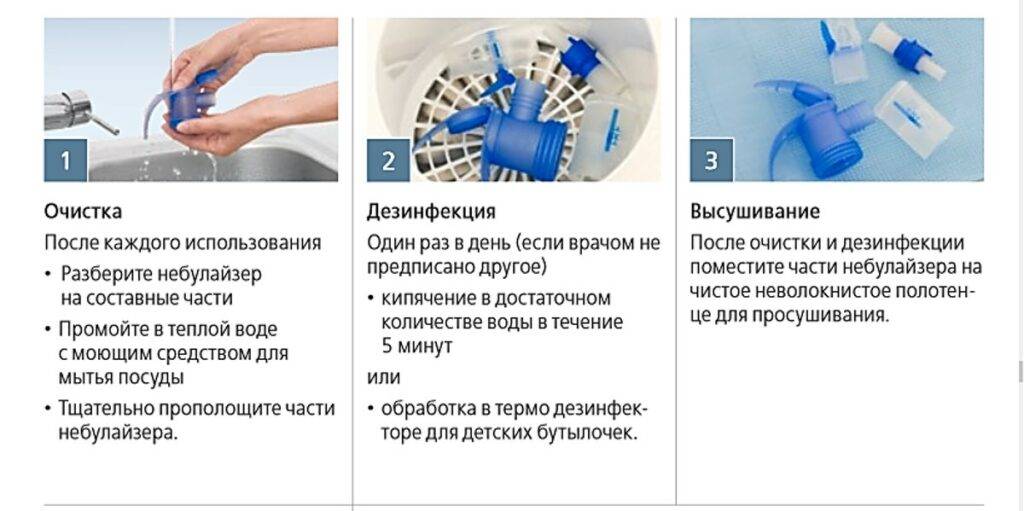 Ингаляторы, которые предназначены для лечения бронхов и легких, после каждой процедуры нужно разбирать. Все съемные части промывают теплой мыльной водой, тщательно прополаскивают и оставляют при комнатной температуре до полного высыхания.