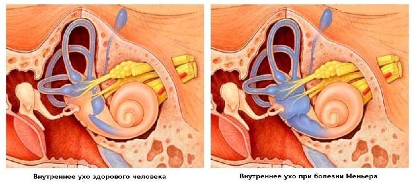 Внутренне ухо здорового человека и при болезни Меньера, выражающейся в увеличении объемов эндолимфы