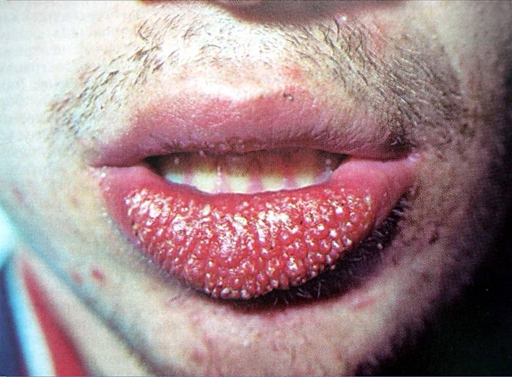 Эту форму можно различить по наличию, пленки серо-белого цвета или желтовато-белому творожистому налету (см. фото выше). Еще для нее характерна отечность и трещины на коже и слизистой оболочке губ.