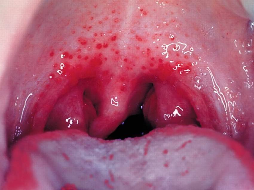- гиперемия мягкого неба, миндалин, дужек задней стенке глотки («пылающий зев»);