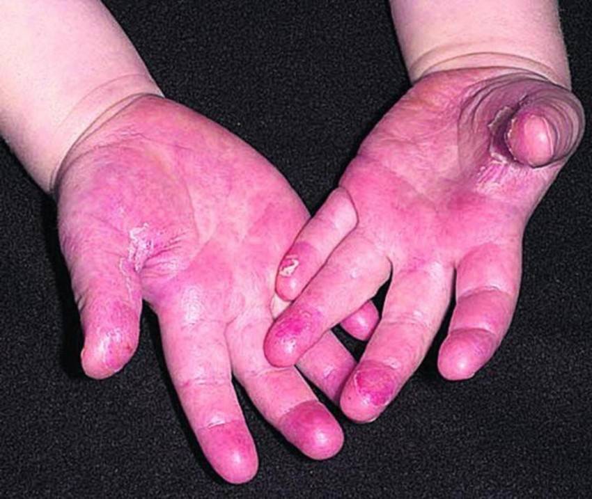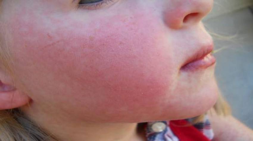 Экзантема на лице локализуется на щеках и лбе. Носогубный треугольник не затрагивается сыпью, а, наоборот, бледнеет (симптом Филатова). Если нажать на высыпания, то они исчезают, а кожа приобретает желтоватый оттенок («симптом ладони»). Через 3-7 дней экзантема исчезает, на ее месте проявляется шелушение. Оно наиболее выражено на руках. На стопах и ладонях формируется крупнопластинчатое шелушение, на остальных участках тела — мелкопластинчатое (отрубевидное). Пигментированных зон после высыпаний не остается.