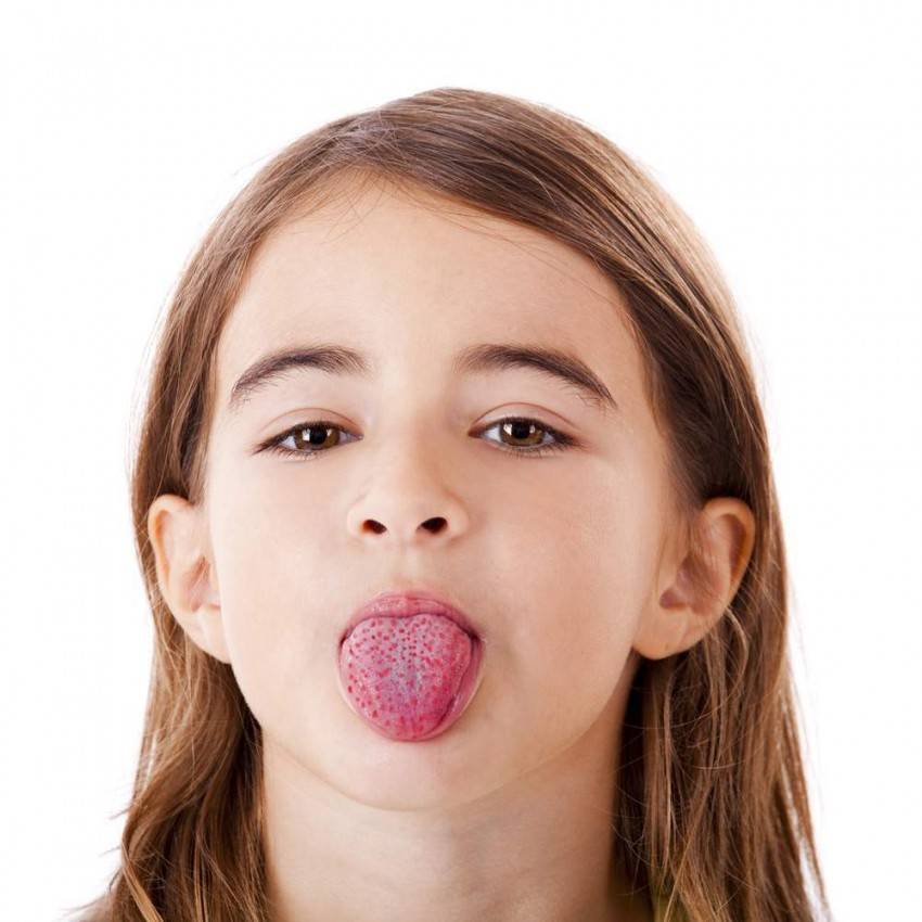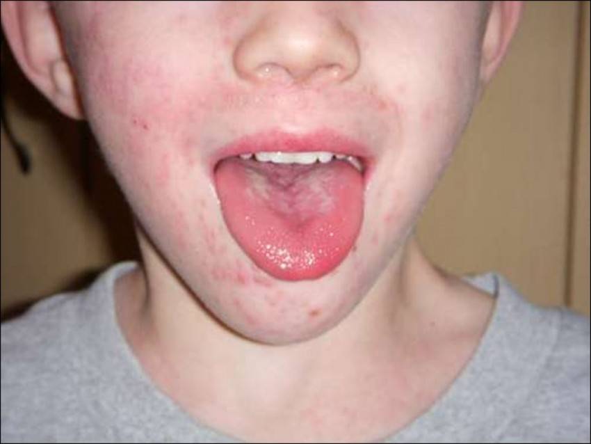 - еще один симптом скарлатины у детей — «малиновый» язык. В начале заболевания на языке формируется белый налет, в некоторых случаях он может приобретать гнойный характер. На второй день поверхность языка становится красной. На ней проявляются увеличенные сосочки;
