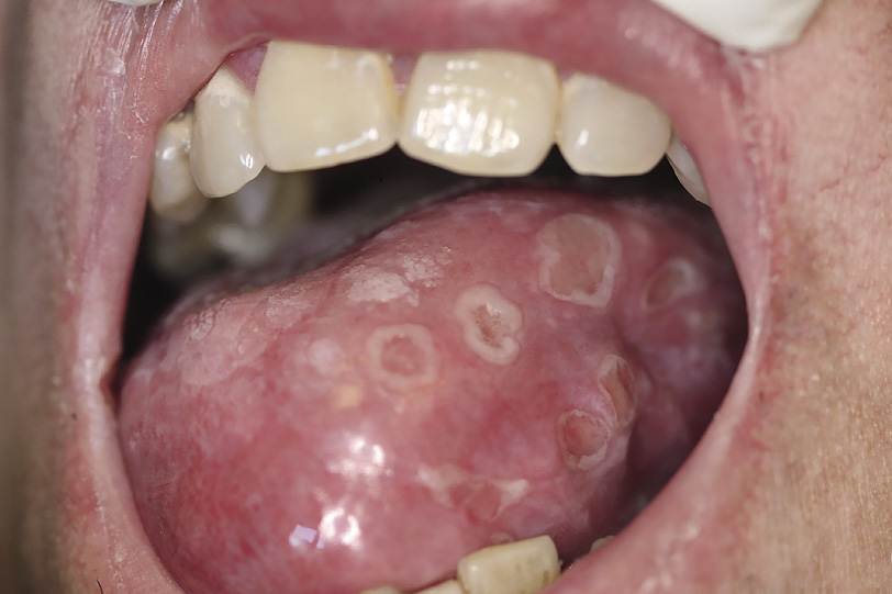 - на слизистой оболочке и на поверхности языка образуются афты с размерами от 5 до 10 мм;