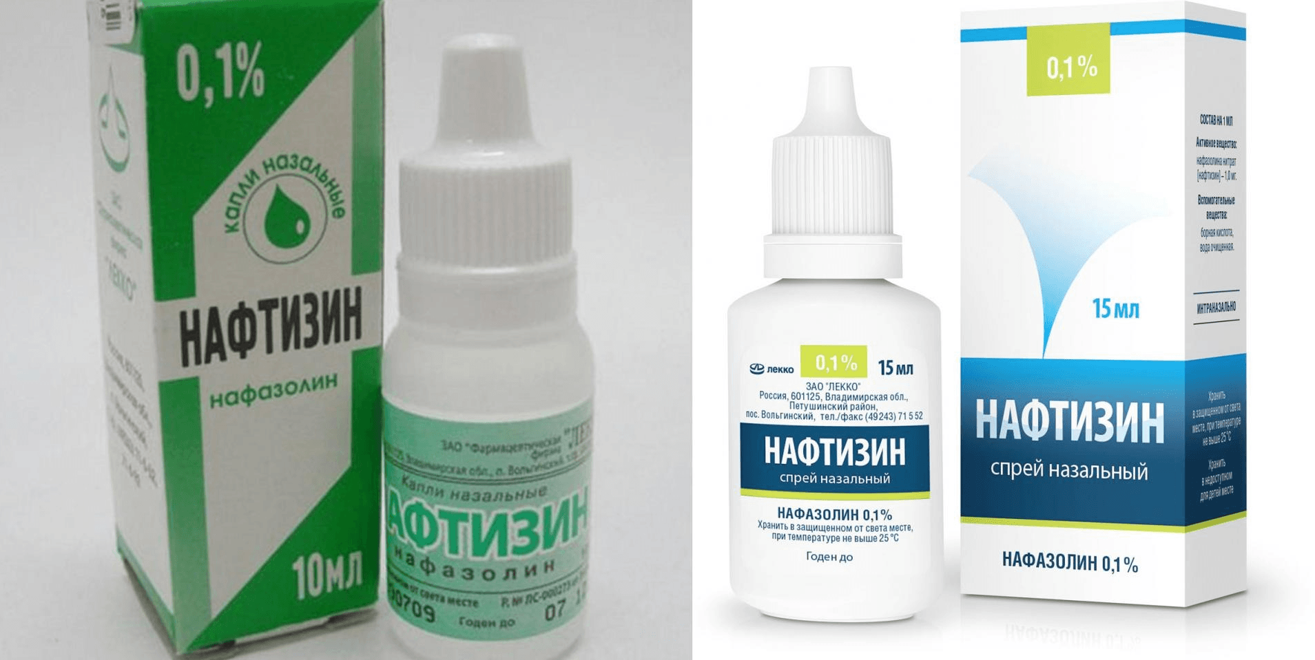 Препарат, в состав которого включён нафазолин, выпускается в форме для детей (0,05 %) и в каплях для взрослых (0,1 %).