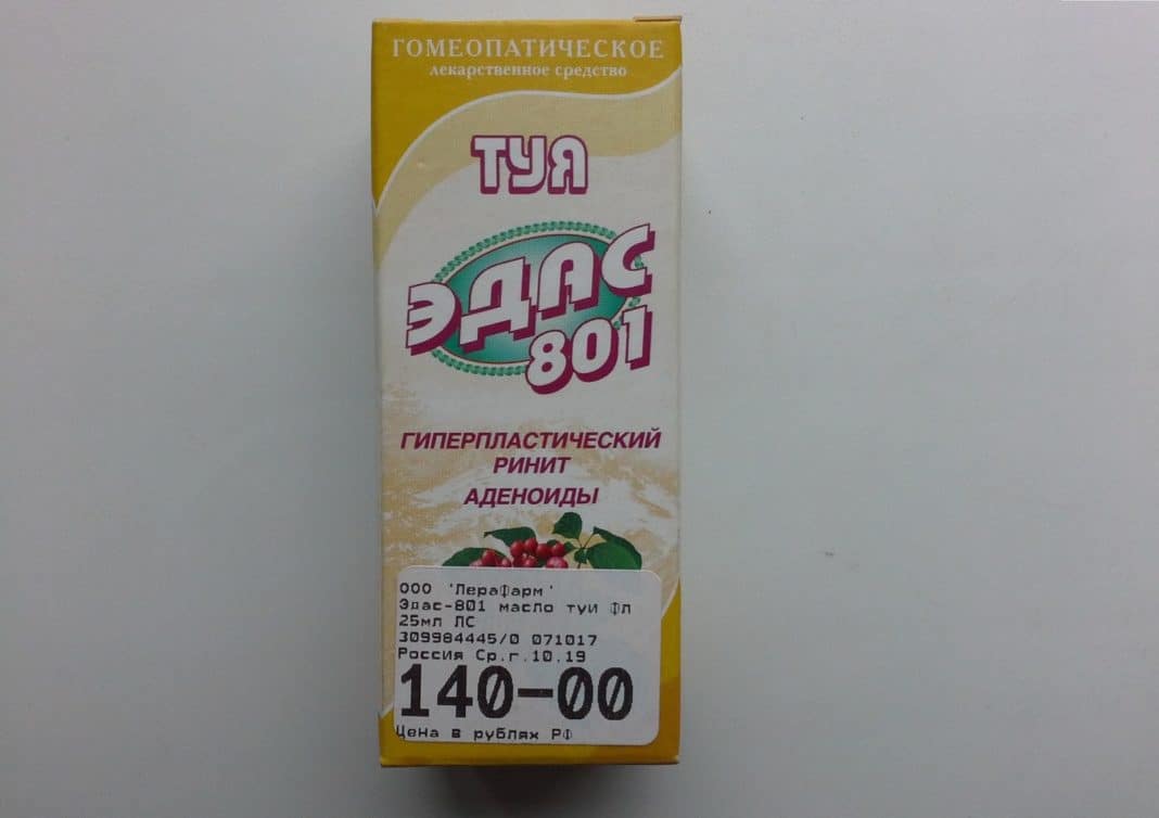 Этот гомеопатический препарат широко применяется в народной и традиционной медицине как универсальное средство лечения респираторных заболеваний. Эдас-801 представляет собой зеленый (иногда желтоватый) раствор, расфасованный в стеклянные темные флаконы объемом 15 или 25 мл. Действующим веществом препарата выступает туя окциденталис. Дополнительным компонентом является оливковое масло. Благодаря уникальному составу Эдас-801 помогает эффективно восстановить носовое дыхание, избавиться от воспалений слизистых тканей ушей, горла